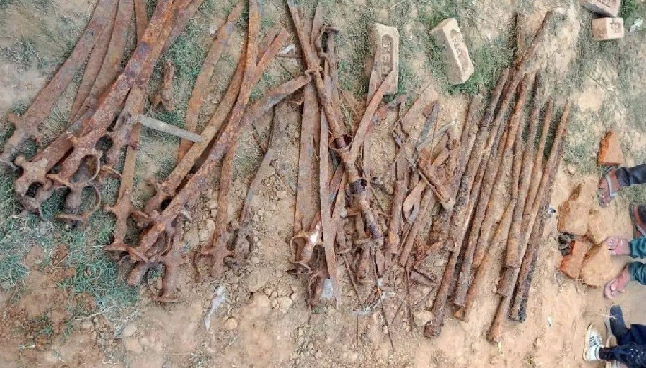 കുറച്ച് ദിവസങ്ങള്ക്ക് മുമ്ബ് ജെസിബി ഉപയോഗിച്ച് പാടത്ത് നിന്ന് മണ്ണ് നീക്കം ചെയ്തിരുന്നു . പിന്നാലെ നിലം ഉഴുതുന്നതിനിടെ ഇരുമ്ബ് കലപ്പയില് ഇടിക്കുന്ന രീതിയിലുള്ള ശബ്ദം ജോലിക്കാർ കേട്ടു. തുടർന്ന് മണ്ണ് നീക്കി നോക്കിയപ്പോഴാണ് ഭൂമിക്കടിയില് നിന്ന് പുരാതന വാളുകളും കഠാരകളും കുന്തങ്ങളും തോക്കുകളും പുറത്തുവന്നത് .