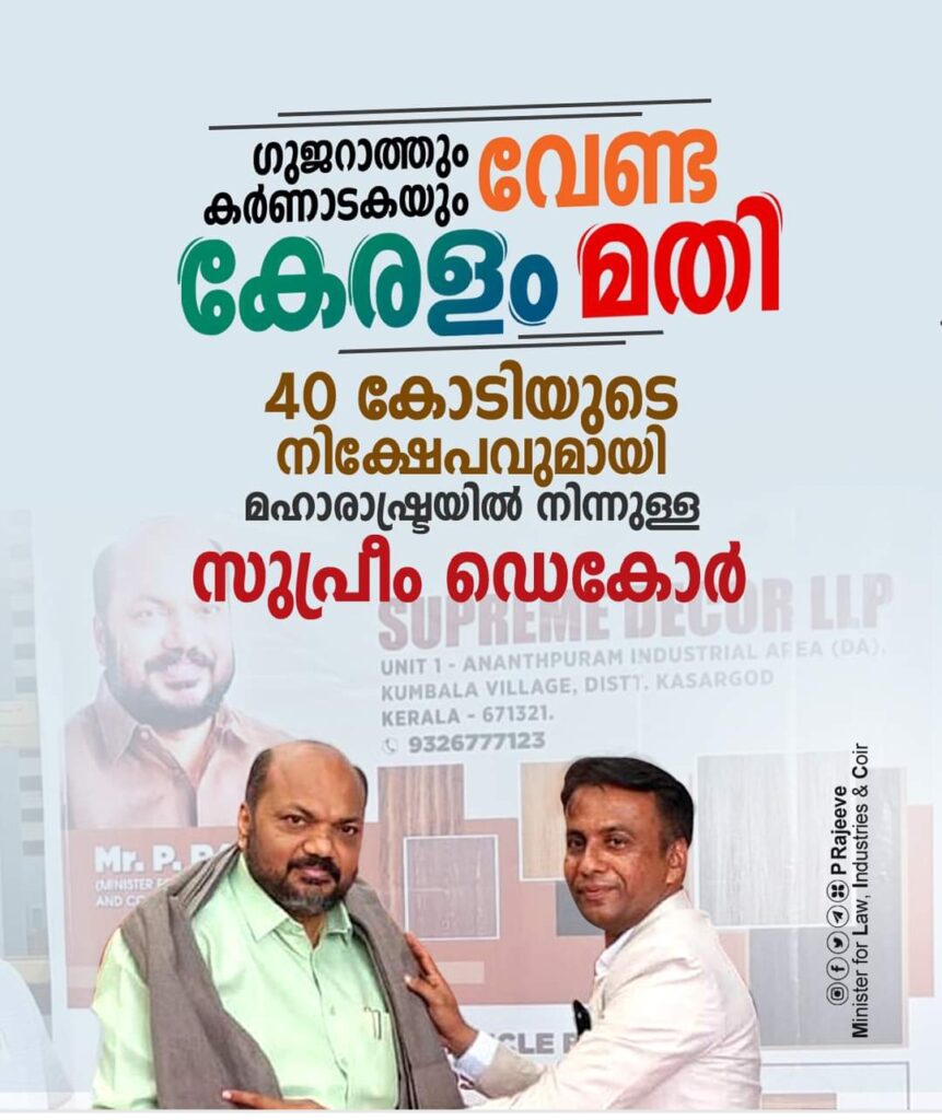 ആദ്യഘട്ടത്തിൽ 5 ഏക്കർ ഭൂമിയാണ് സുപ്രീം ഡെകോറിനായി അനുവദിച്ചിരുന്നത്. ഈ സ്ഥലത്ത് വളരെ വേഗത്തിൽ നിർമ്മാണപ്രവർത്തനങ്ങൾ നടത്തുകയും പദ്ധതി അതിവേഗം മുന്നോട്ടുകൊണ്ടുപോകുകയും ചെയ്തതോടെയാണ് കാസർഗോഡിന് മുതൽക്കൂട്ടാകുന്ന സംരംഭത്തിന് 5 ഏക്കർ കൂടി ഭൂമി വീണ്ടും അനുവദിച്ചത്. പൂർണമായും പ്രവർത്തനക്ഷമമാകുമ്പോൾ 40 കോടി രൂപയുടെ നിക്ഷേപവും പ്രത്യക്ഷത്തിൽ 350 പേർക്കും പരോക്ഷമായി 400 പേർക്കും തൊഴിൽ ലഭ്യമാക്കുന്ന ഈ മാനുഫാക്ചറിങ്ങ് യൂണിറ്റ് കാസർഗോഡിൽ കഴിഞ്ഞ ദിവസം ആരംഭിച്ച 13 വ്യവസായ സ്ഥാപനങ്ങളിലൊന്നാണ്. ഉന്നത നിലവാരത്തിലുള്ള പാർട്ടിക്കിൾ ബോർഡുകൾ ലഭ്യമാകുന്നതോടെ ഓഫീസ് ടേബിൾ, കിച്ചൺ ക്യാബിനറ്റുകൾ തുടങ്ങിയവ നിർമ്മിച്ചു നൽകുന്ന മറ്റ് വ്യവസായങ്ങളും കേരളത്തിലുണ്ടാകുമെന്നാണ് പ്രതീക്ഷിക്കുന്നത്.
