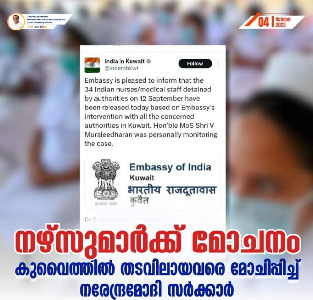 കുവൈത്തിൽ തടവിലാക്കപ്പെട്ട നഴ്സുമാരടക്കം 34 ഇന്ത്യക്കാരുടെ മോചനം സാധ്യമായ വിവരം സന്തോഷത്തോടെ പങ്കുവയ്ക്കുന്നു… വിദേശകാര്യമന്ത്രാലയവും മേഖലയുടെ ചുമതലയുള്ള മന്ത്രിയെന്ന നിലയിൽ വ്യക്തിപരമായി ഞാനും നടത്തിയ ഇടപെടലുകൾ ഫലം കണ്ടത് ചാരിതാർഥ്യമേകുന്നു… മോചിപ്പിക്കപ്പെട്ടവരിൽ ബഹുഭൂരിപക്ഷവും മലയാളികളാണ് എന്നത് ഇരട്ടിസന്തോഷം നൽകുന്നു….. തടവിലാക്കപ്പെട്ടവരിലെ അമ്മമാർക്ക് പിഞ്ചു കുഞ്ഞുങ്ങളെ മുലയൂട്ടാനുള്ള സൗകര്യം നേരത്തെ ഒരുക്കാൻ സാധിച്ചിരുന്നു…… മതിയായ രേഖകൾ ഇല്ലാതെ നഴ്സുമാർ കുവൈത്തിൽ എത്തിയതിൽ ഇന്ത്യയുടെ വിശദീകരണം അംഗീകരിക്കുകയും മനുഷ്യത്വപരമായ സമീപനം സ്വീകരിക്കുകയും ചെയ്ത കുവൈത്ത് അധികാരികൾക്ക് നന്ദി… ലോകത്തെവിടെയും ഭാരതീയ പൗരൻമാരുടെ ക്ഷേമവും സുരക്ഷയും ഉറപ്പാക്കാൻ നരേന്ദ്രമോദി സർക്കാർ പ്രതിജ്ഞാബദ്ധം