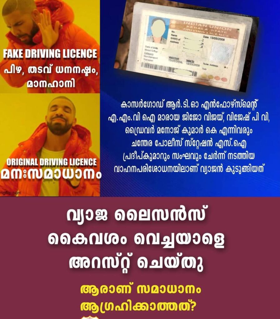 വ്യാജ ലൈസൻസ് കൈവശം വെച്ചയാളെ അറസ്റ്റ് ചെയ്തു. തൃക്കരിപ്പൂർ: കാസർഗോഡ് ആർ.ടി.ഓ എൻഫോഴ്സ്മെന്റ് ഉദ്യോഗസ്ഥരുടെ പരാതിയെ തുടർന്ന് വ്യാജ ലൈസൻസ് കൈവശം വയ്ക്കുകയും ഉപയോഗിക്കുകയും ചെയ്ത വ്യക്തിയെ പോലീസ് അറസ്റ്റ് ചെയ്തു. തൃക്കരിപ്പൂരിലെ ബഷീർ മൻസിൽ ,അബ്ദുൽ റഹ്മാൻ മകൻ ഉസ്മാനെയാണ് വ്യാജലൈസന്സ് കൈവശം വച്ചതിന് അറസ്റ്റ് ചെയ്തത്. ഇയാൾക്ക് വ്യാജലൈസൻസ് നിർമ്മിക്കാൻ ഒത്താശ ചെയ്ത എസ് ആൻഡ് എസ് ഡ്രൈവിംഗ് സ്കൂളിലെ പ്രൊപ്രൈറ്റർ ശ്രീജിത്തിനെയും അറസ്റ്റ് ചെയ്തു. എൻഫോഴ്സ്മെന്റ് എ.എം.വി ഐ മാരായ ശ്രീ.ജിജോ വിജയ് സി.വി വിജേഷ് പി വി, ഡ്രൈവർ മനോജ് കുമാർ കെ എന്നിവർ ചന്തേര പോലീസ് സ്റ്റേഷൻ എസ് .ഐ ശ്രീ. പ്രദീപ്കുമാറും ചേർന്ന് ബുധനാഴ്ച തൃക്കരിപ്പൂർ ഭാഗത്ത് സംയുക്തമായി വാഹന പരിശോധന നടത്തവേ ഡ്രൈവിംഗ് ലൈസൻസ് ഇല്ലാതെ പ്രതിയായ ഉസ്മാനെയാണ് വാഹനം ഓടിക്കുന്നത് ശ്രദ്ധയിൽപ്പെട്ടത്. ലൈസൻസ് ഹാജരാക്കാൻ ആവശ്യപ്പെട്ടപ്പോൾ ടിയാൻ പിന്നീട് വാട്സ്ആപ്പ് വഴി ലൈസൻസ് അയച്ചു നൽകുകയായിരുന്നു. എന്നാൽ ഈ ലൈസൻസ് നമ്പർ പരിശോധിച്ചപ്പോൾ തിരുവനന്തപുരം സ്വദേശിനിയുടെ പേരിലുള്ള ലൈസൻസ് ആണെന്ന് ബോധ്യപ്പെട്ടതിന്റെ അടിസ്ഥാനത്തിൽ നടത്തിയ അന്വേഷണത്തിൽ ഇത് വ്യാജലൈസൻസ് ആണെന്ന് ബോധ്യപ്പെട്ടത്തിന്റെ അടിസ്ഥാനത്തിൽ ടിയാനെതിരെ ചന്തേര പോലീസ് സ്റ്റേഷനിൽ കേസ് രജിസ്റ്റർ ചെയ്യുകയുണ്ടായത്. തുടർ അന്വേഷണത്തിലാണ് കാഞ്ഞങ്ങാട് സബ് ആർ.ടി.ഓ യുടെ പരിധിയിലുള്ള എസ്. ആൻഡ്. എസ് ഡ്രൈവിംഗ് സ്കൂൾ ഉടമയുടെ ഒത്താശയോടെയാണ് പ്രതി ലൈസൻസ് കരസ്ഥമാക്കിയത് എന്ന് ബോധ്യമായി. ശ്രീജിത്തിന് കാഞ്ഞങ്ങാട് ഗുരുവനം ടെസ്റ്റിംഗ് ഗ്രൗണ്ടിൽ നിന്ന് ഐ.പി മനുരാജ് ജി.പി , സബ് ഇൻസ്പെക്ടർ പ്രദീപ് കുമാർ എന്നിവരുടെ നേതൃത്ത്വത്തിലുള്ള പോലീസ് സംഘം അന്വേഷണം പുരോഗമിച്ചു കൊണ്ടിരിക്കുവാണ്. ഇത്തരത്തിൽ വ്യാജ ലൈസൻസ് നിർമിക്കുകയും ഉപയോഗിക്കുന്നവർക്കും എതിരെ ശക്തമായ നിയമ നടപടി സ്വീകരിക്കുമെന്നും ,വാഹനം ഉപയോഗിക്കുന്ന ഡ്രൈവർമാർ അവരുടെ ഒറിജിനൽ ലൈസൻസ് കൈവശം സൂക്ഷിക്കുകയോ അല്ലെങ്കിൽ ഡിജിറ്റൽ ഫോർമാറ്റിൽ എം. പരിവാഹൻ ഡിജിലോക്കർ പോലുള്ള അംഗീകൃത ആപ്പുകളിൽ ഡിജിറ്റൽ ഫോർമാറ്റിൽ സൂക്ഷിക്കുകയോ ചെയ്യണമെന്ന് കാസർഗോഡ് എൻഫോഴ്സ്മെന്റ് ആർ.ടി.ഒ എ. സി.ഷീബ അറിയിച്ചു.