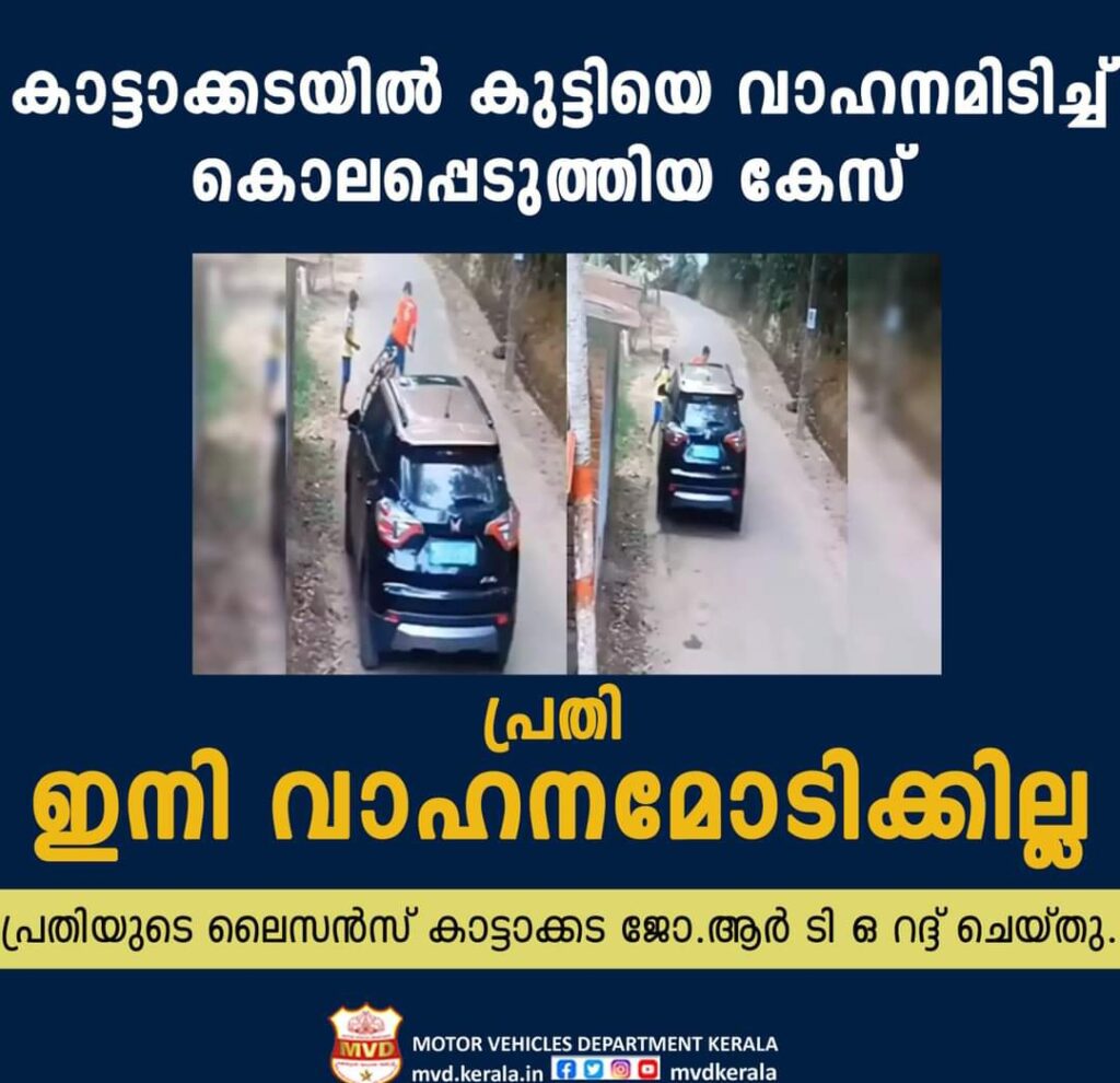 പ്രതിയായ പ്രീയരഞ്ജ നെതിരെ മോട്ടോർ വെഹിക്കിൾസ് ഇൻസ്പെക്ടർ അന്വേഷണം നടത്തുകയും മന:പ്പൂർവ്വം ഇത്തരമൊരു ക്രൂര കൃത്യം നടത്തിയാളുടെ ലൈസൻസ് എന്നന്നത്തേക്കുമായി റദ്ദ് ചെയ്യാൻ ശുപാർശ നൽകുകയും ടി റിപ്പോർട്ടിൻ്റെ അടിസ്ഥാനത്തിൽ കാട്ടാക്കടയിൽ സ്കൂൾ കുട്ടിയെ കാറിടിച്ച് കൊലപ്പെടുത്തിയ കേസിലെ പ്രതി പ്രീയ രഞ്ജൻ എസ്. അറിൻ്റെ ലൈസൻസ് എന്നന്നത്തേക്കുമായി റദ്ദ് ചെയ്യുകയും ചെയ്തിരിക്കുന്നു.