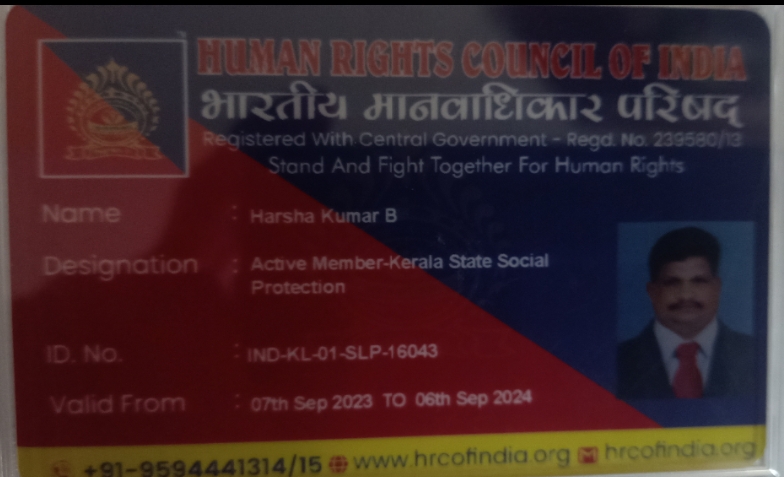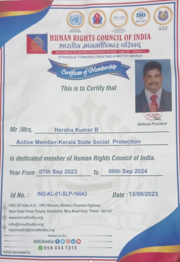 ഹ്യൂമൻ റൈസ് കൗൺസിൽ ഓഫ് ഇന്ത്യ *കേരള സ്റ്റേറ്റ് ആക്ടീവ് മെമ്പർ *ആയി ഹർഷകുമാറിനെതിരഞ്ഞെടുത്തിരിക്കുകയാണ് നിലവിൽ ബിഎംടിവി ന്യൂസ് ചാനലിന്റെ ചെയർമാനും വിഘ്നേശ്വരാ ചാരിറ്റബിൾ ട്രസ്റ്റ് *പ്രസിഡന്റുമാണ് *കേരള മീഡിയ പേഴ്സൺ യൂണിയൻറെ സംസ്ഥാന സമിതി അംഗമാണ് *.സ്ത്രീകൾക്കും കുട്ടികൾക്കും എതിരെയുള്ള അതിക്രമങ്ങൾ ശക്തമായി നേരിടുമെന്നും *സാധാരണ ജനങ്ങൾക്ക് ഗവൺമെൻറ് സ്ഥാപനങ്ങളിൽ ന്യായമായ നീതി ലഭിച്ചില്ല എങ്കിൽ അതിനെതിരെ ശക്തമായി പ്രതികരിക്കുമെന്നും റോഡിൽ അലഞ്ഞു തിരിയുന്ന അഗതികൾക്ക് ഗവൺമെൻറ് സെൽട്ടർ ഉണ്ടാക്കി നൽകണമെന്നും* തെരുവിൽ അലയുന്ന രോഗബാധിതരെ കണ്ടെത്തി അവർക്ക് വേണ്ടെ ചികിത്സ ലഭ്യമാക്കേണ്ട. നടപടി സ്വീകരിക്കുമെന്നു* പ്രകൃതിക്കും നേരെയുള്ള അതിക്രമങ്ങൾ ശക്തമായി നേരിടുവന്നും *ഇന്ത്യയ്ക്കകത്ത് വീട് ഇല്ലാത്തവർക്കായി 100 പദ്ധതി കേന്ദ്ര കേരള ഗവൺമെൻറ് മായി ആലോചിച്ച് നടപ്പിലാക്കുമെന്നും *ഇന്ത്യയ്ക്കകത്ത് *ഭൂരഹിതരെ കണ്ടെത്തി സർക്കാരുകളുമായി ബന്ധപ്പെട്ട മറ്റു ഇതര സ്ഥാപനങ്ങളുമായി ബന്ധപ്പെട്ട ഭൂമി വാങ്ങി കൊടുക്കുന്നതിനുള്ള നടപടി സ്വീകരിക്കുമെന്നും *അസുഖബാധിതരെ കണ്ടെത്തി വൈദ്യസഹായം നൽകുമെന്നും *ജീവജാലങ്ങൾക്കെതിരെയുള്ള അതിക്രമങ്ങൾ എവിടെ നടന്നാലും അതിനെ ശക്തിയുക്തം നേരിടുമെന്നും *ഇന്ത്യയ്ക്കകത്തുള്ള ഹോസ്പിറ്റലുകളിൽ അടിസ്ഥാന സൗകര്യങ്ങൾ മെച്ചപ്പെടുത്തുന്നതിനായി സർക്കാരുകളുമായി ബന്ധപ്പെട്ട ശ്രമിക്കു *ഇന്ത്യയ്ക്കകത്ത് പ്രവർത്തിക്കുന്ന പല സ്ഥാപനങ്ങളും ഇ എസ് എ ഫണ്ട് വിനിയോഗിക്കുന്നില്ല എന്ന് ശ്രദ്ധയിൽപ്പെട്ടിട്ടുള്ളത് *ഇതിനെതിരെ ശക്തമായ നടപടി സ്വീകരിക്കുമെന്നും *ഗവൺമെന്റിന്റെ ഭാഗത്തുനിന്ന് റോഡുകളോ മെയിൻറനൻസ് ചെയ്യാതെ ജനങ്ങൾക്ക് എന്തെങ്കിലും അപകടം സംഭവിച്ചാൽ അതിനെതിരെ കോടതികൾ വഴി ശക്തമായി പ്രതികരിക്കുമെന്നും വിഘ്നേശ്വരാ ചാരിറ്റബിൾ ട്രസ്റ്റ് ചേർന്ന് നൂറു വീട് പദ്ധതി എത്രയും പെട്ടെന്ന് ഇന്ത്യക്ക് ആരംഭിക്കുമെന്നും റോഡിൽ അലഞ്ഞുതിരിഞ്ഞു നടക്കുന്നവരെ പാർപ്പിക്കുന്നതിനായി ഷട്ടർ ഹോം ഉടൻ ആരംഭിക്കുമെന്നും* ഇന്ത്യയ്ക്ക് അകത്തെ പോലീസ് സ്റ്റേഷനുകളിൽ നീച പ്രവർത്തികൾ ജനങ്ങൾക്കെതിരെ നടത്തുന്ന പോലീസുകാരെ കണ്ടെത്തി നടപടി സ്വീകരിക്കുന്നതിന് ശ്രമിക്കും ഹ്യൂമൻ കൗൺസിൽ ഓഫ് ഇന്ത്യ എന്നെ ഏൽപ്പിച്ച കർത്തവ്യം ഞാൻ ഭംഗിയായി നടത്തുമെന്ന് മാധ്യമങ്ങളോട് പറഞ്ഞു