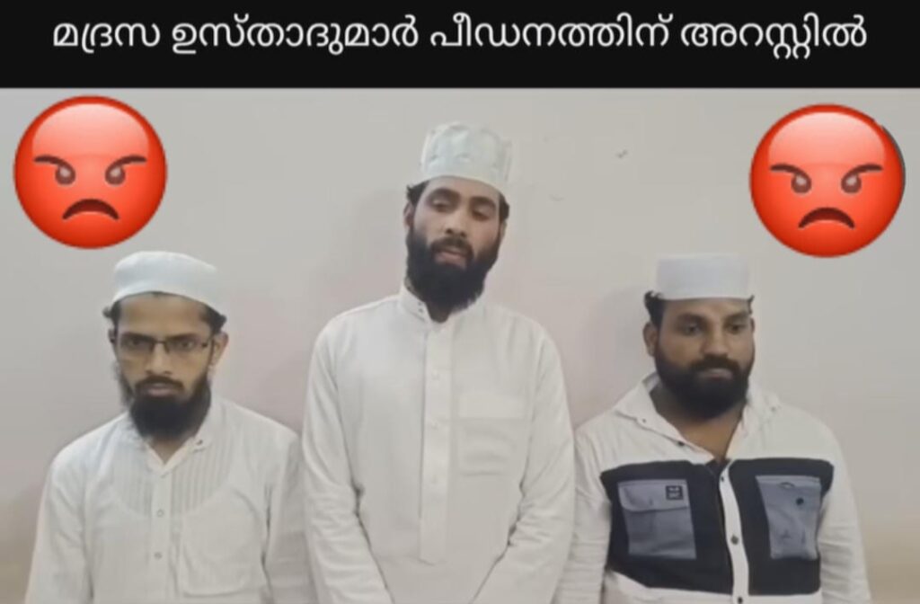 മദ്രാസയുടെ മറവിൽ കുട്ടികളെ ലൈംഗിക പീഡനത്തിന് ഇരയാക്കിയ മൂന്ന് ഉസ്താദുമാർ അറസ്റ്റിൽ തിരുവനന്തപുരം നെടുമങ്ങാട് മദ്രസ നടത്തിയിരുന്ന ഉസ്താദുമാരാണ് പോലീസ് പിടിയിലായത് കൊച്ചുകുട്ടികളെ പ്രകൃതിവിരുദ്ധ പീഡനത്തിന് ഇരയാക്കിയെന്ന് സി ഡബ്ല്യു സി ക്ക് ലഭിച്ച വിവരത്തിന്റെ അടിസ്ഥാനത്തിൽ നെടുമങ്ങാട് പോലീസ് ഉസ്താദ്മാരെ അറസ്റ്റ് ചെയ്തു