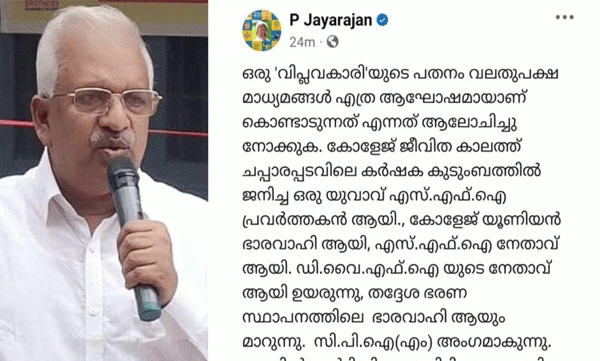 സിപിഎം ജില്ലാ കമ്മിറ്റിയില് നിന്ന് ഒഴിവാക്കിയ മനു തോമസിനെതിരായ പി ജയരാജന്റെ ഫെയ്സ്ബുക് കുറിപ്പില് സിപിഎമ്മില് അതൃപ്തി. ഫേസ്ബുക്കില് പി ജയരാജനും മനു തോമസും ഇന്നലെ ഏറ്റുമുട്ടിയിരുന്നു. ആരെയെങ്കിലും ലക്ഷ്യമിട്ട് തെറ്റായ ആരോപണം ഉന്നയിച്ചാല് പാർട്ടി കൂട്ടുനില്ക്കില്ലെന്നും തിരുത്തേണ്ടത് മനു തോമസ് ആണെന്നുമായിരുന്നു ജയരാജന്റെ പോസ്റ്റ്. ജില്ലാ കമ്മിറ്റി അംഗം ആയതിനു പിന്നാലെ വ്യാപാര സംരഭങ്ങളില് നിന്ന് ഒഴിവാകണമെന്ന നിർദേശം മനു പാലിച്ചില്ലെന്നും ഒരു വിപ്ലവകാരിയുടെ പതനം മാധ്യമങ്ങള് ആഘോഷമാക്കുന്നത് സിപിഎം വിട്ടതുകൊണ്ടെന്നും ജയരാജൻ വിമർശിച്ചു. ജയരാജനെതിരെ രൂക്ഷ പ്രതികരണവുമായി മനു തോമസും ഫെയ്സ്ബുക്കില് കുറിപ്പിട്ടു. ക്വാറി മുതലാളിമാർക്ക് വേണ്ടി ഏരിയ സെക്രട്ടറിമാരെ സൃഷ്ടിക്കുന്ന പാടവവും പാർട്ടിയില് ഗ്രൂപ്പ് ഉണ്ടാക്കാൻ നോക്കിയതും മകനെയും ക്വട്ടേഷൻകാരേയും ഉപയോഗിച്ച് കെട്ടിപ്പൊക്കിയ കച്ചവടങ്ങളും ജനം അറിയട്ടെ എന്നും സംവാദത്തിന് ക്ഷണിക്കുന്നുവെന്നും കുറിപ്പില് പറഞ്ഞിരുന്നു. പാർട്ടിയെ പലതവണ പ്രതിസന്ധിയിലാക്കിയ ആളാണ് ജയരാജനെന്നും ഇപ്പോള് താങ്കളുടെ അവസ്ഥ പരമ ദയനീയമാണെന്നും മനു തോമസ് പറഞ്ഞു. അനവസരത്തിലെ പോസ്റ്റ് വിഷയം വഷളാക്കിയെന്നാണ് പാര്ട്ടി നേതൃത്വത്തിന്റെ് വിലയിരുത്തല്. വിഷയത്തില് പാര്ട്ടി ജില്ലാ സെക്രട്ടറി എംവി ജയരാജൻ ഔദ്യോഗികമായി വിശദീകരിച്ച് വാര്ത്താ സമ്മേളനം നടത്തിയ ശേഷം പി.ജയരാജൻ ഫേയ്സ്ബുക്കില് കുറിപ്പിട്ടത് അനുചിതമായെന്നാണ് പാര്ട്ടി നേതൃത്വത്തിന്റെ് വിലയിരുത്തല്.